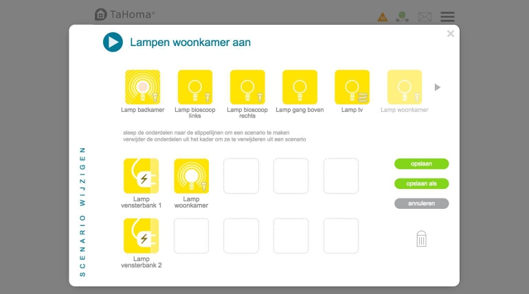 Een scenario is een functie om diverse toepassingen (producten) met één druk op te knop samen te laten reageren. Zo kun je een scenario aanmaken waarmee met één druk op de knop je rolluiken sluiten, de lichten uitgaan en de thermostaat lager gezet wordt. Of je kunt een scenario ‘tv kijken’ aanmaken waardoor met één druk op de knop de lichten gedimd worden en de elektrische raamdecoratie sluit. Je kunt alle producten koppelen om zo een scenario naar eigen wens in te richten. Ook dit werkt met een drag-and-drop-interface waardoor je overzichtelijk ziet wat je koppelt in één scenario. In ons geval konden alleen de Hue-lampen en slimme stekkers reageren dus daarvoor hebben we een scenario ingesteld waarbij met één druk op de knop alle verlichting uitgeschakeld wordt.
