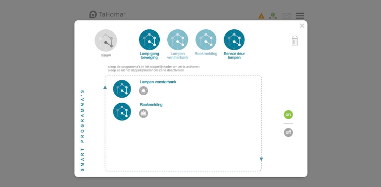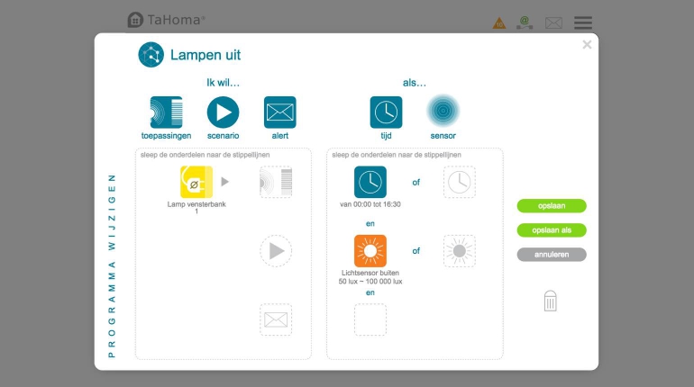 Via de webinterface van TaHoma kun je ook de notificaties instellen. Je hebt de keuze om notificaties per mail, per sms of per puhsbericht te ontvangen. Mail en pushberichten zijn gratis, voor sms-berichten moet je betalen. In de webinterface kun je vervolgens aan de slag met het instellen van scenario’s, schema’s en smart-toepassingen. Dit kun je beter op een tablet of computer doen want ook hier geldt dat bepaalde functies niet toegankelijk zijn via je smartphone. Zo kun je de smart-toepassingen op je smartphone alleen uitzetten of aanzetten, niet bewerken.