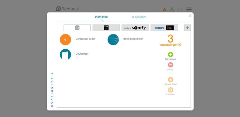 Een sensor of ander apparaat aan de TaHoma toevoegen is vrij eenvoudig. Via ‘configuratie’ kom je in een scherm waar allerlei producten toegevoegd kunnen worden. Je hebt een tab voor producten die gebruikmaken van het io-protocol van Somfy (producten van Somfy zelf en die door Somfy ondersteund worden), een tab voor producten die middels RTS werken (radiofrequenties) and een tab voor ‘andere Somfy producten’. Afhankelijk van de sensor of het product dat je wilt toevoegen kies je de tab en voeg je een nieuw product toe.