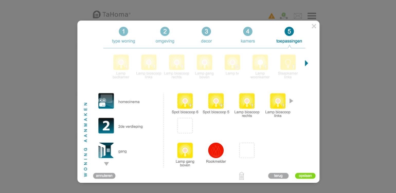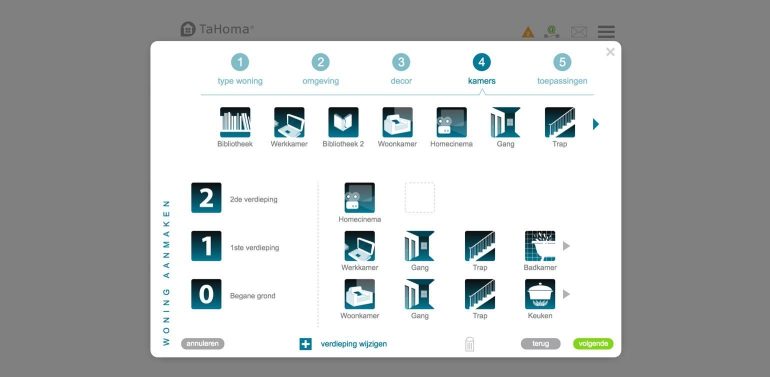 Het eerste dat we gedaan hebben is ons huis vormgeven. Je kunt via de interface aangeven hoe je tuin eruit ziet, hoeveel verdiepingen met wat voor kamers je hebt en hoe de voortuin eruit ziet. Ook kun je een carpoort of een garage toevoegen. Op deze manier krijg je een virtuele weergave van je huis, en op elke locatie (in elke ruimte) kun je de producten die je aan het TaHoma-systeem toevoegt plaatsen.