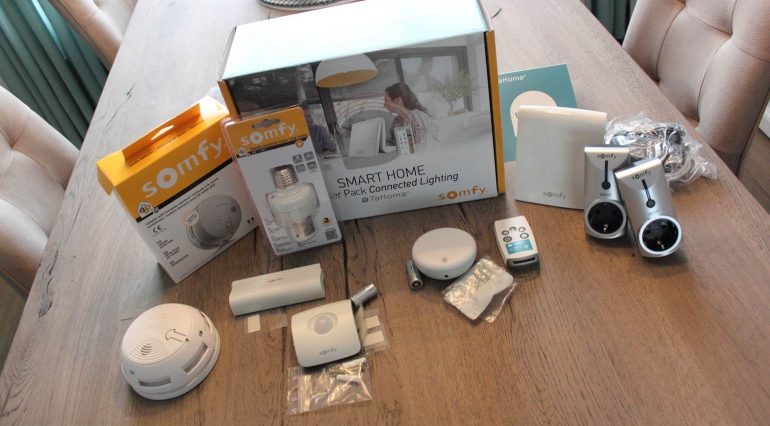 Op de website van Somfy staat een groot aantal sensoren, melders en pakketten met andere producten (motoren voor garagedeuren en Philips Hue-lampen bijvoorbeeld) waar je uit kunt kiezen. Wij hebben voor deze review twee slimme stekkers, een rookmelder, een bewegingsmelder, een openingsmelder en een lichtsensor ontvangen. Daarnaast natuurlijk de TaHoma-centrale.