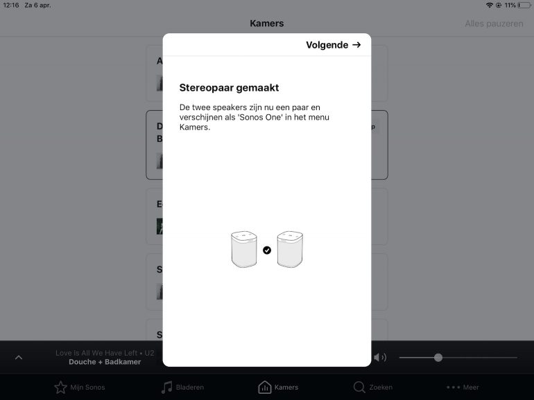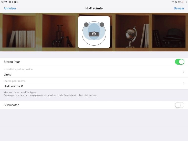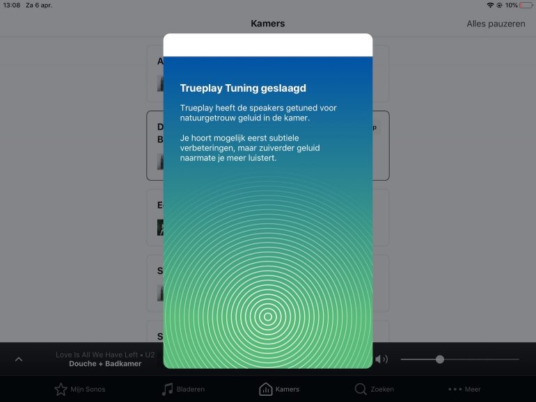 Een pluspunt bij Sonos is Trueplay, een functie die op basis van een simpele geluidsmeting de eigenschappen van je kamer vaststelt en de klank aanpast. Het meten houdt in dat je een minuut lang knullig zwaait met een iPhone of iPad – Android-gebruikers vallen uit de boot – waarna de Sonos-speaker zich aanpast aan de ruimte. Het is vaak heel effectief, al zijn er beperkingen. In onze grote open keuken met tegelvloer kan Trueplay geen redding brengen, maar in de woonkamer wel. Niet onlogisch, want dingen als reflecties moet je aanpakken met akoestische ingrepen, niet met software. Tijdens de test in onze werkruimte hebben we de Trueplay-functie getest met een stereopaar van Sonos Ones. Mét Trueplay werd de speaker helderder, maar de bassen werden te veel gedempt.