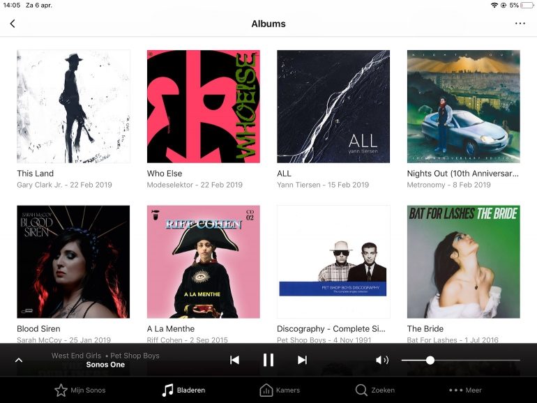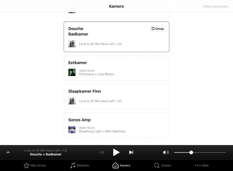 Bij Sonos geloven ze in ‘simpel is beter’. Kamers verschijnen in een tekstlijst binnen het hoofdscherm. Alles is heel helder en je moet weinig stappen nemen om ergens te raken. Als je eigen bestanden en abonnementen op meerdere streamingdiensten gebruikt blijkt de universele zoekfunctie van Sonos een enorm pluspunt. Als je bijvoorbeeld zoekt naar ‘Daft Punk’, dan krijg je resultaten over alle diensten en je eigen collectie heen. Niemand anders, incluis Yamaha, heeft iets gelijkaardig. Zoeken kan enkel binnen één dienst of je muziekcollectie. De meerwaarde van de Sonos-zoekfunctie is natuurlijk klein als je slechts één streamingdienst gebruikt.