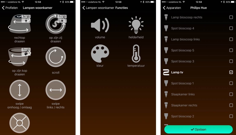 Dus, je kiest een profiel, kiest een beweging (of een touchpad-actie), selecteert de functie die je wilt koppelen (helderheid verlichting, kanaal wijzigen tv, kleur verlichting, nummer van muziek, volume, etc.) en kiest het apparaat waarop deze functie uitgevoerd moet worden (infrarood, Hue, Sonos, LIFX, etc). Vervolgens is het afhankelijk van het apparaat dat je gekozen hebt welke opties je krijgt. Kies je voor infrarood dan moet de Spin Remote gaan leren welk infraroodsignaal uitgestuurd moet worden. Dit doe je door de knop van de betreffende functie op de originele afstandsbediening van het product ingedrukt te houden, naar de Spin remote te wijzen en hem zo te leren welk signaal uitgestuurd moet worden. Heb je voor Philips Hue gekozen dan kun je nog de lampen die moeten reageren op deze specifieke functie selecteren. Hetzelfde geldt voor Sonos en toekomstige compatibele apparaten.