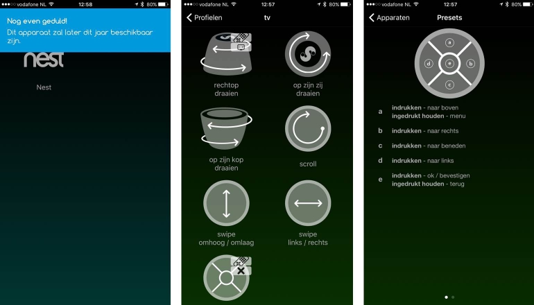 Dankzij de integratie van diverse sensoren weet de Spin remote precies hoe je hem vasthoudt en welke beweging je maakt. Geen enkele keer wordt de beweging niet of slecht geregistreerd. Wel was het in het begin zo dat we het met draaien soms ‘overschoten’. Zo konden we lastig de gewenste kleur van de Hue-lampen bereiken of schoten we een aantal tv-zenders te ver door. Gelukkig is er in de app de mogelijkheid om de gevoeligheid van het draaien aan te passen waardoor dit probleem verdwijnt. Daarbij geeft de remote stevige en duidelijke feedback dankzij trillingen. Je voelt dus ook wat je aan het doen bent.