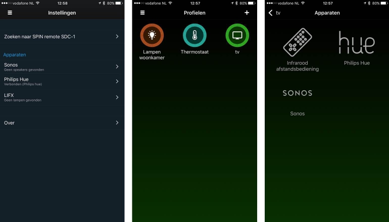 Het aanmaken van een profiel is zeer eenvoudig, maar voordat je dat doet is het goed om te weten waar de Spin remote compatibel mee is. Het apparaat beschikt over infraroodzenders die het signaal 360 graden uitsturen en zodoende alle apparaten die op infrarood werken (neem je tv of decoder) kunnen bedienen. Deze apparaten kun je dus koppelen. Daarnaast bieden de developers van Spin remote integratie met smart home-apparaten. Je bent afhankelijk van de apparaten die zij (willen en kunnen) ondersteunen en op dit moment zijn dat Sonos, Philips Hue en LIFX. Binnenkort wordt ook Nest aan dit aanbod toegevoegd.
