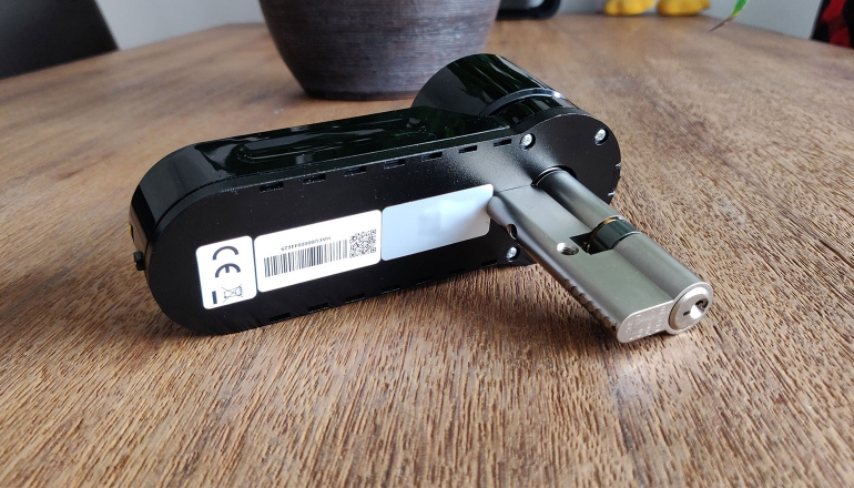 Onder de grote draaiknop, waar ook het gemotoriseerde onderdeel in zit, zit nog een touchpaneel. Dit zijn kleine knopjes die je kunt gebruiken voor het instellen van het apparaat. Die knoppen kun je tevoorschijn toveren door een aantal seconden drie vingers op het paneel te laten rusten. Als het goed is zie je die knoppen alleen tijdens het installeren. Dat langwerpige onderkant gebruik je voor de rest dan ook niet. Wat echter opvalt is dat het slot een paar millimeter uitsteekt. Wij gebruiken het model met een 30/30-cilinder.