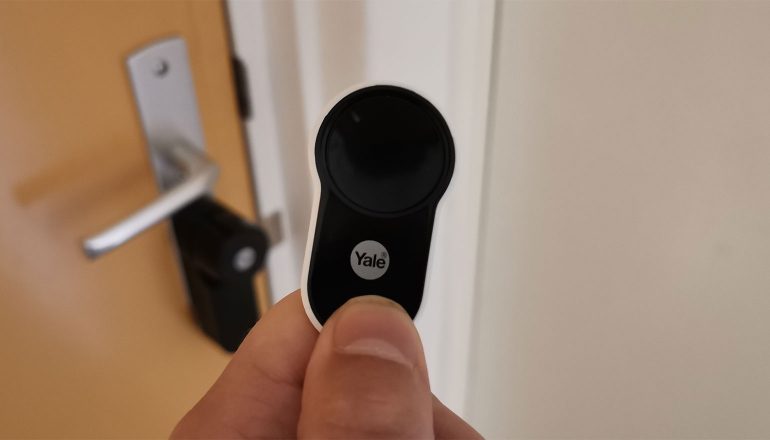 Mogelijk heeft dat iets te maken met het magneetje dat je op de deurpost dient te plakken. Middels dat magneetje weet de Yale Entr wanneer het slot in gebruik wordt genomen en draait hij zichzelf op slot wanneer de deur dicht zit. Blijft de deur te dicht bij dat magneetje, dan kan er verwarring ontstaan. Verder is het mogelijk de draaiknop op de Entr te gebruiken om de deur te openen. Je drukt hem dan naar binnen en draait hem helemaal naar links. Dit voelt aan als een natuurlijke handeling; handig voor wanneer je de sleutelhanger niet bij de hand hebt.