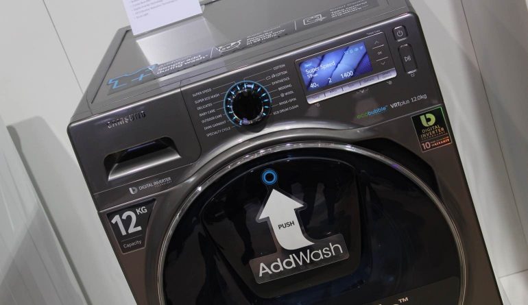 Eén van de nieuwe en slimme producten die Samsung tijdens het forum toonde was de AddWash, een wasmachine met een unieke extra feature en een aantal slimme functies. De extra feature is de mogelijkheid om was die je vergeten bent na het starten van de wasmachine alsnog toe te voegen. Dit gebeurt middels een klepje aan de voorzijde, waardoor truien, broeken, sokken en onderbroeken eenvoudig naar binnen geschoven kunnen worden. Druk simpelweg op de pauze-knop, gooi de sokken bij de was en de was wordt voortgezet. Een relatief kleine aanpassing die volgens Samsung een groot probleem, of in ieder geval iets dat veel mensen tegenkomen, oplost.