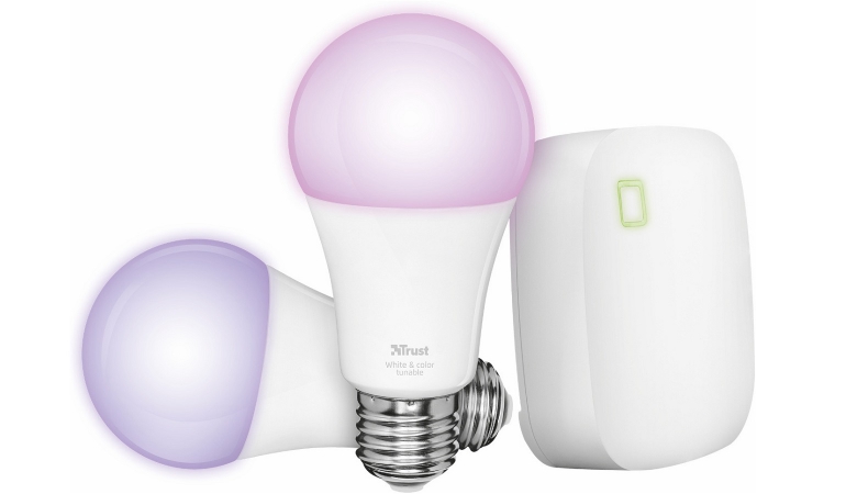 Een van de goedkopere Zigbee-setjes van Trust is de Warm White set, bestaande uit drie slimme Warm White LED-lampen met een normale E27-fitting, een Z1 control station en een afstandsbediening. Daarnaast is er bijvoorbeeld ook een Starter Set Color, waarbij je tevens nog kunt kiezen uit twee of drie lampen. De Color-editie maakt gebruik van 16 miljoen kleuren. Wanneer de lampen aan de bridge gekoppeld zijn, kun je ze van afstand dimmen, maar je kunt ze bijvoorbeeld ook aan- of uit laten gaan als een sensor beweging of geluid detecteert. En er zijn dus ook lampen van bijvoorbeeld Philips Hue aan dezelfde bridge te koppelen.