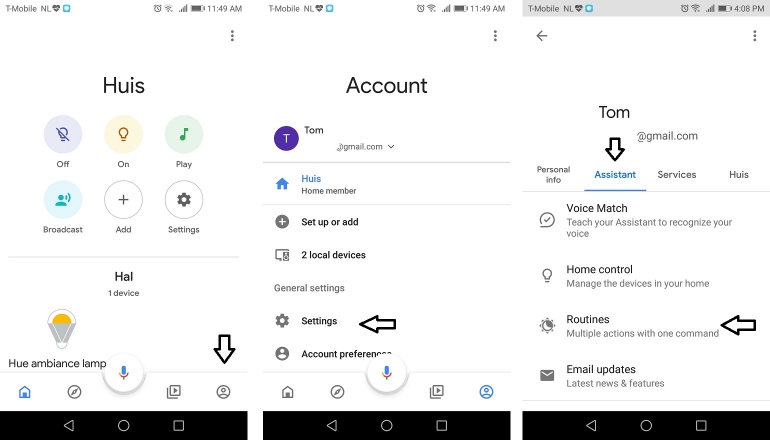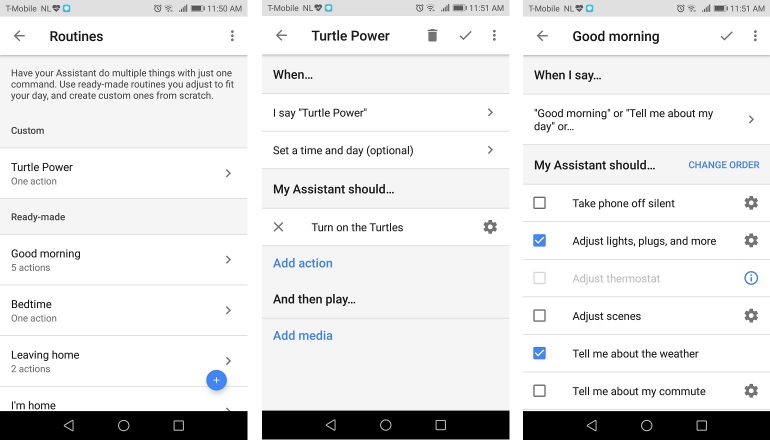 Routines laten je, door middel van een enkel stemcommando, meerdere acties uitvoeren. Een voorbeeld is ‘Hey Google, good morning’. Zo kun je instellen dat dit ene commando de lichten in de slaapkamer aanzet, je telefoon van de stille modus haalt, het weerbericht voorleest, de temperatuur van de thermostaat hoger zet en vervolgens muziek van je favoriete playlist van Spotify wordt afgespeeld. Op dit moment zijn er zes verschillende routines in te stellen, namelijk Good Morning, Bedtime, I’m Home, Leaving Home, Commuting to work en Commuting home. Zo kun je acties bundelen voor dagelijkse taken met één enkel stemcommando.