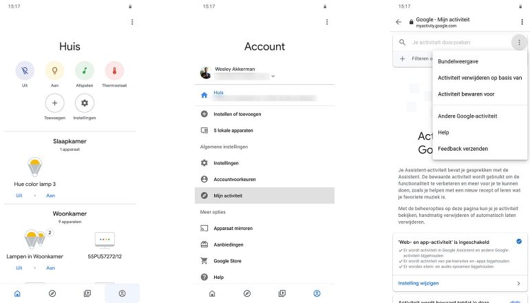 Je kunt ervoor kiezen individuele opnamen te verwijderen. Je opent de Google Home-app en klikt onderaan op het icoontje van je account (helemaal rechts). Vervolgens tap je op de regel Mijn activiteit. Hier vind je een lijst met opnamen die in de afgelopen periode gemaakt zijn. Je kunt per opname beslissen of je hem wil beluisteren of verwijderen door erop te tappen (al zul je vaak iets als ‘onbekende opname’ zien staan). Verwijderen doe je door rechts op de drie puntjes te tappen en de optie Verwijderen te kiezen.