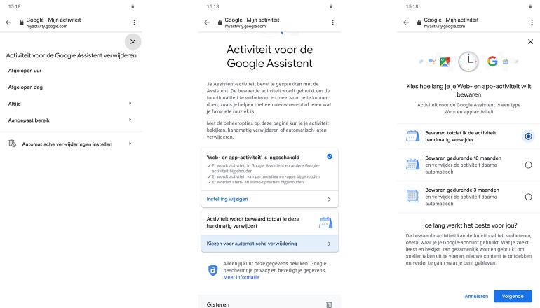 Open wederom de Google Home-app en ga ook nu naar je activiteitenpagina. Voordat je ergens op tapt, scroll je eerst een stukje naar beneden. Het duurt niet lang voordat je het kopje ‘Activiteit word bewaard totdat je deze handmatig verwijdert’ ziet staan. Tap hierop en kies vervolgens voor de optie die je prettig vindt. Je kunt kiezen tussen handmatige verwijdering, verwijdering tot achttien maanden en verwijdering tot drie maanden. Na de gekozen optie worden de gegevens automatisch door het Google-systeem verwijderd.